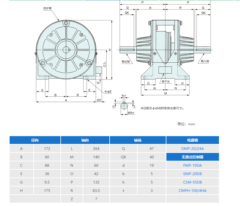 軸径(Φmm)19 質量(kg)6.0 消費電力(W)8 静摩擦トルク(kgm)2.8 寸法(全長×全高×全幅W)(mm)264×175×172