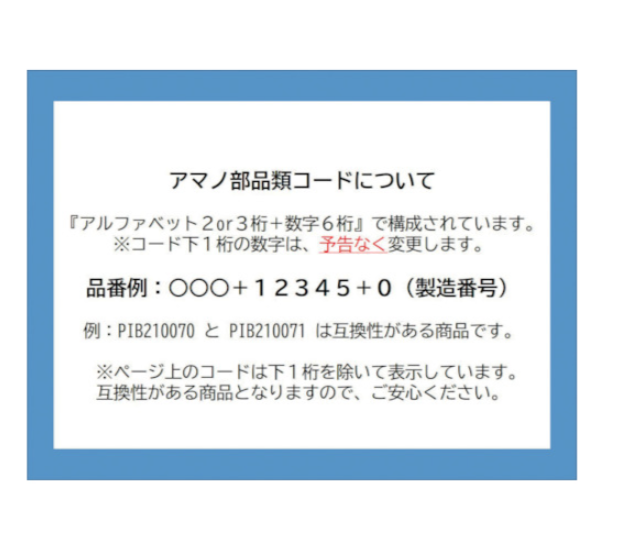アマノ部品類コードについて:『アルファベット2or3桁+数字6桁』で構成されています。※コード下1桁の数字は、予告なく変更します。