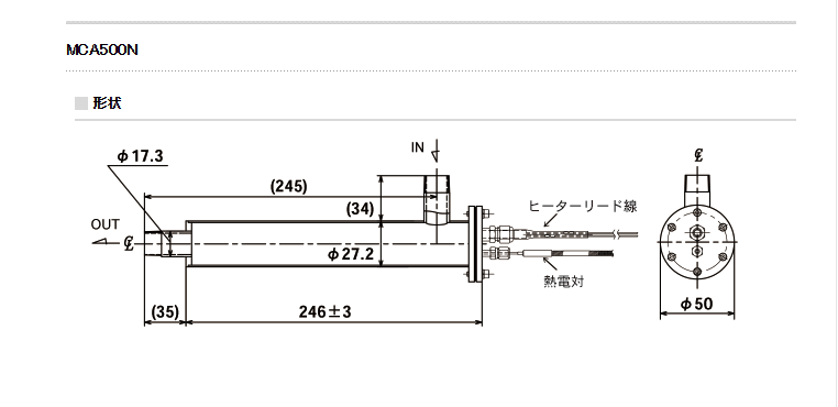 材質SUS316製(ヒーターシース・シース熱電対)、SUS304製(筐体)