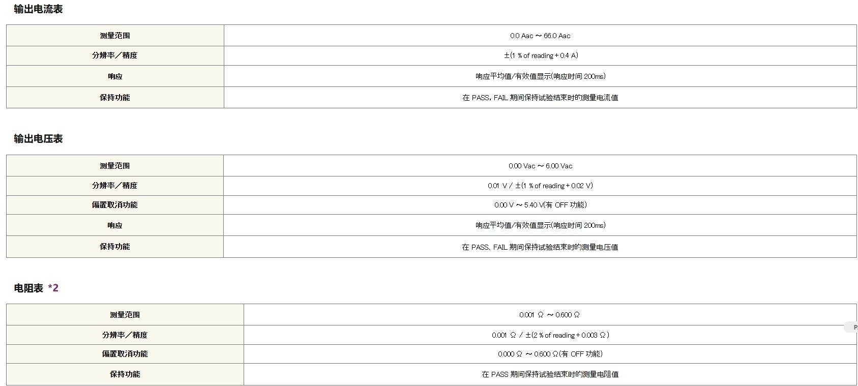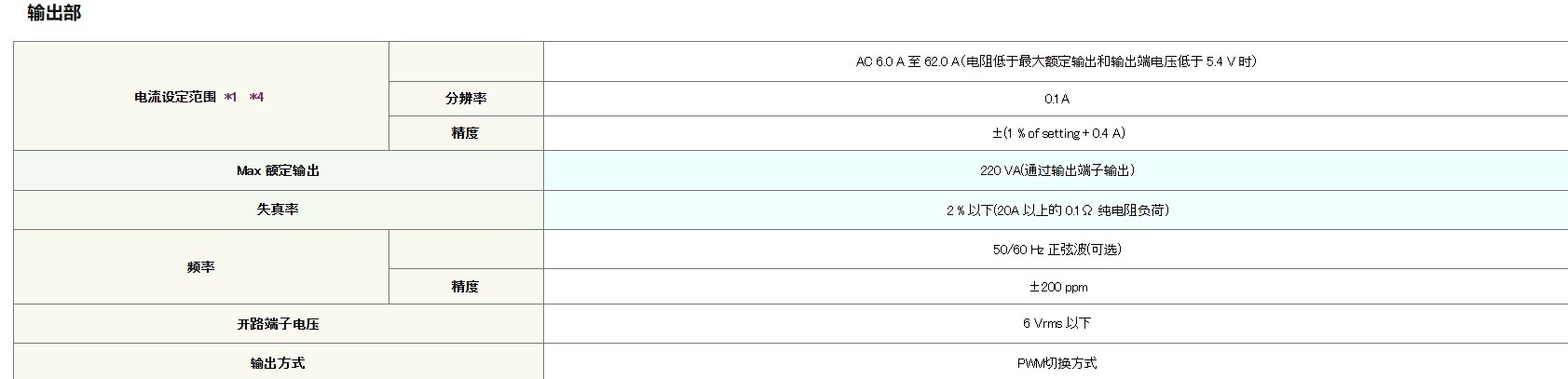 输出电流:6.0~62.0A AC,分辨率 0.1A,精度 ±(1% 设定值 + 0.4A);最大额定输出 220VA,开路电压 ≤6V rms,输出端子电压 ≤5.4V。